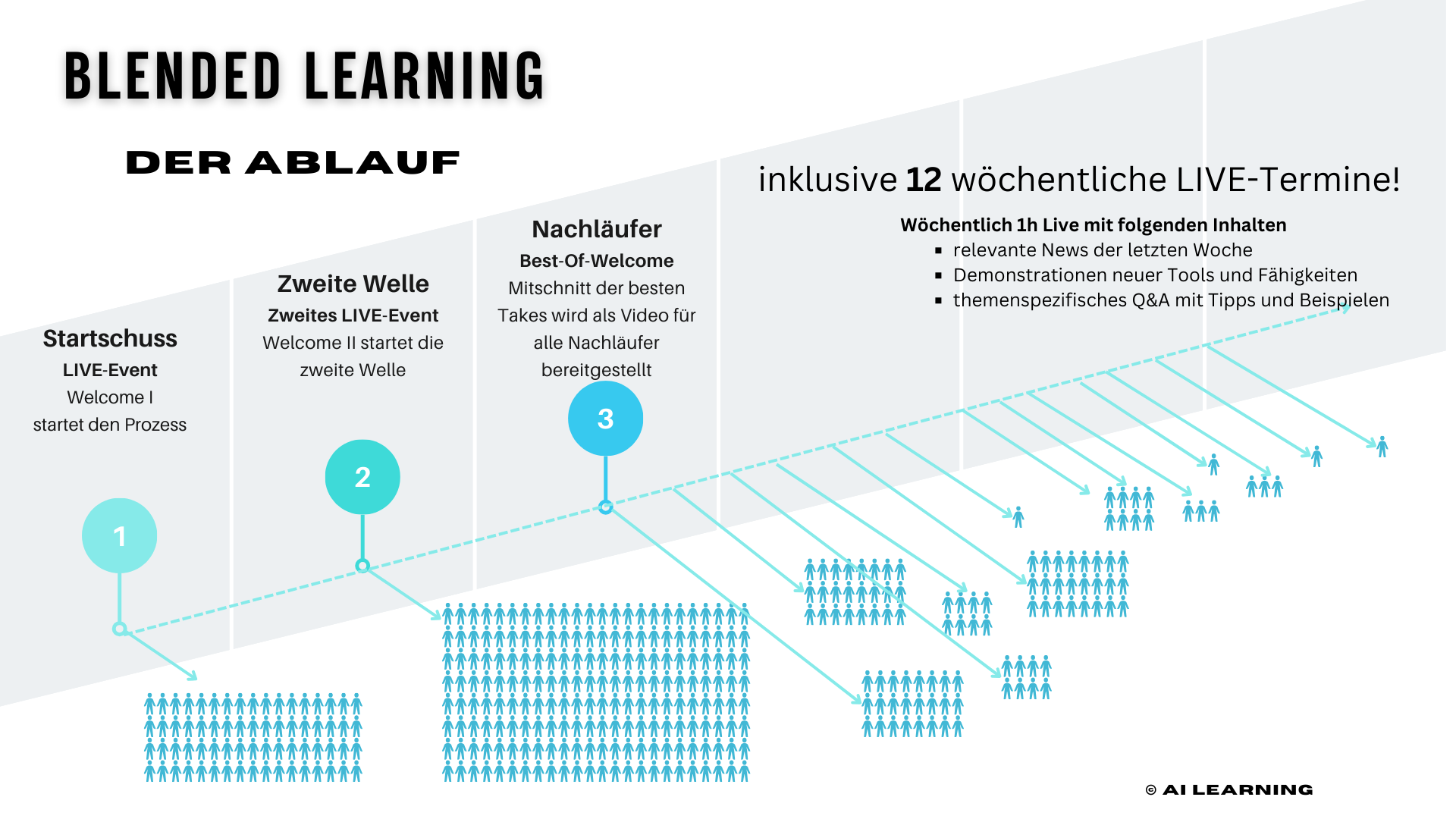 Begleitet werden die Mitarbeiter in den ersten 12 Wochen durch wöchentliche LIVE-Sessions von jeweils 1h Dauer. Hier werden relevante News der letzten Woche vorgestellt und neue Tools und neue Fähigkeiten bestehender Tools demonstriert. In einem themenspezifischen Q&A haben die Mitarbeiter dann die Möglichkeit, Anworten auf ihre Fragen, hilfreiche Tipps und erklärende Beispiele zu bekommen.